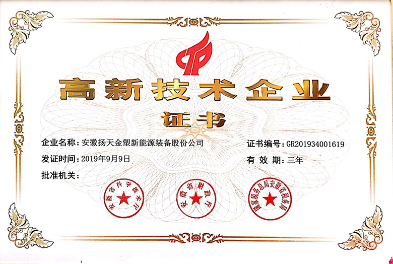 獲此殊榮,是社會各界對安徽揚天金塑新能源裝備股份公司自成立以來發展成績的支持和肯定,也是社會各界以及廣大用戶的支持和厚愛。“高新技術企業"不僅是一種榮譽,更是一種責任,這一證書的獲得,既是對安徽揚天金塑新能源裝備股份公司的研發能力和整體技術水平的肯定和認定,也是對公司研發創新人員的一種激勵和鞭策,給廣大客戶提供了信心保證,增強了員工的積極性,同時標志著我司的技術研發能力已經邁向更高臺階。技術權威機構的認可,必將進一步激發公司全員科技創新的熱情,進一步增強以自主研發為核心的綜合創新能力。安徽揚天金塑新能源裝備股份公司將以此為契機和動力,努力實現跨越式發展。