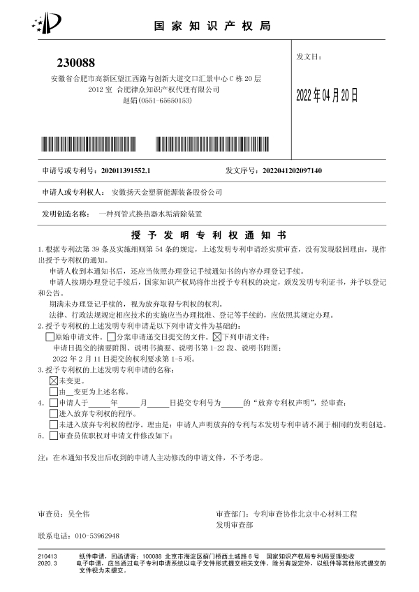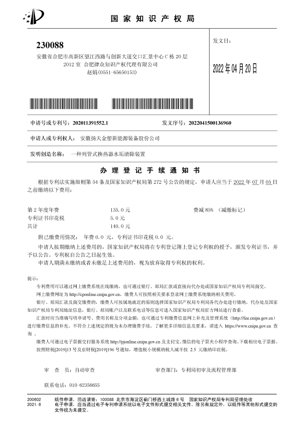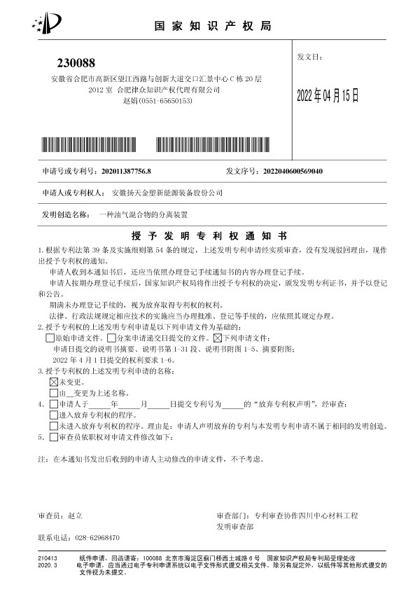 熱烈祝賀我公司《一種油氣混合物的分離裝置》、《一種列管式換熱器水垢清除裝置》發明專利獲得國家知識產權局授權,并分別于2022年4月15日、4月20日獲得發明專利證書。